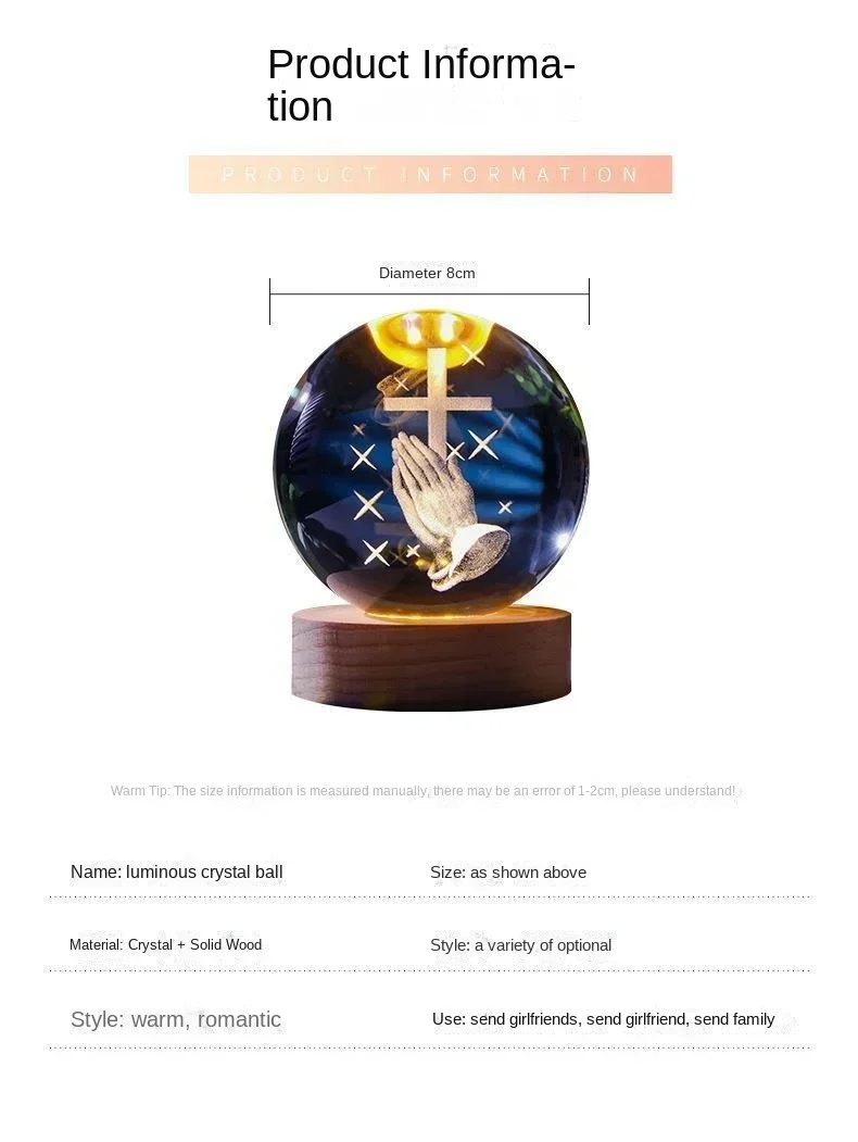 A Luminária Esfera de Cristal 3D une arte e tecnologia para criar um efeito visual único. Através de uma gravação interna de alta precisão, a imagem é projetada dentro do cristal puro, criando uma ilusão de profundidade que encanta em qualquer ângulo, criada pra trazer serenidade, fé e uma iluminação suave ao ambiente. Um objeto delicado